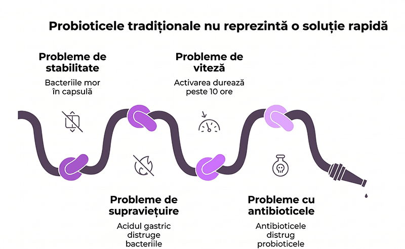 Probioticul tradițional nu este o soluție rapidă, deoarece este alcătuit din bacterii vii, dar extrem de fragile. Pentru a acționa, acestea trebuie să supraviețuiască mediului extrem de acid al stomacului, să ajungă în intestin, să găsească hrană (prebiotice), să se „activeze” și abia apoi să înceapă să producă substanțe benefice. Acest proces este lent (adesea peste 10 ore) și foarte nesigur.