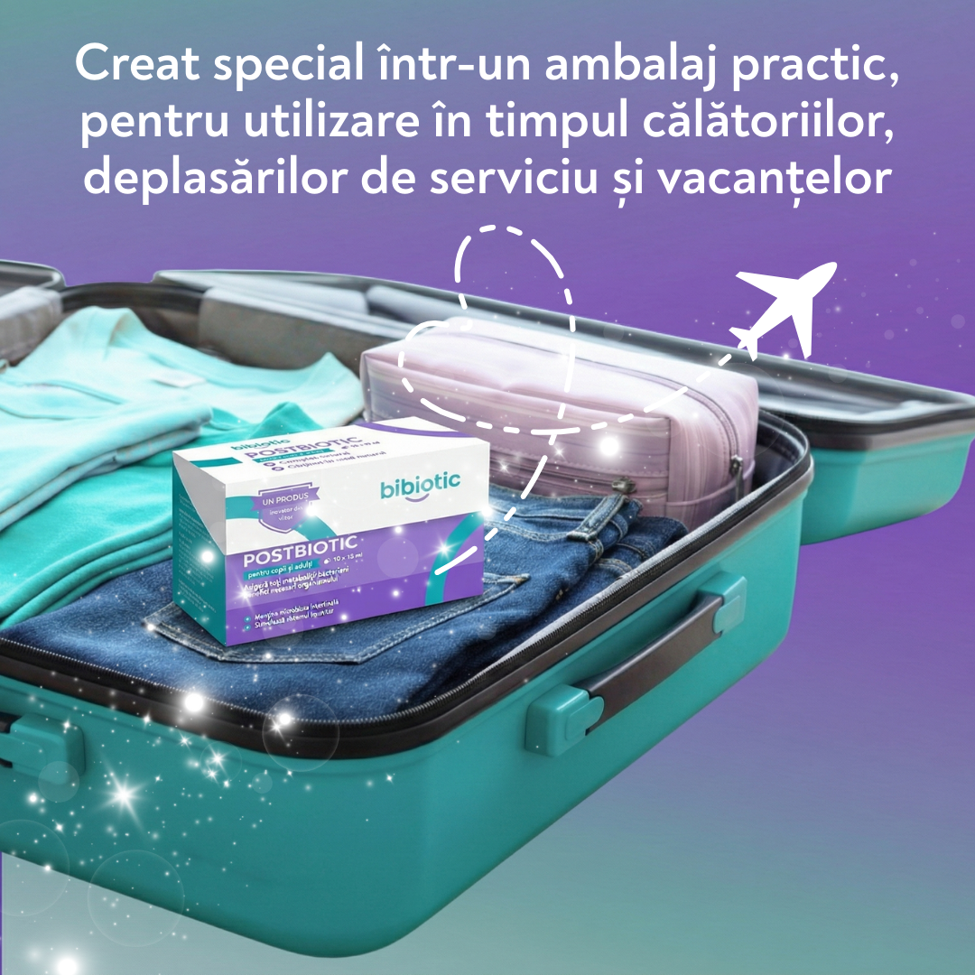 Formula postbiotică este concepută special pentru persoanele care călătoresc frecvent sau își schimbă adesea mediul.